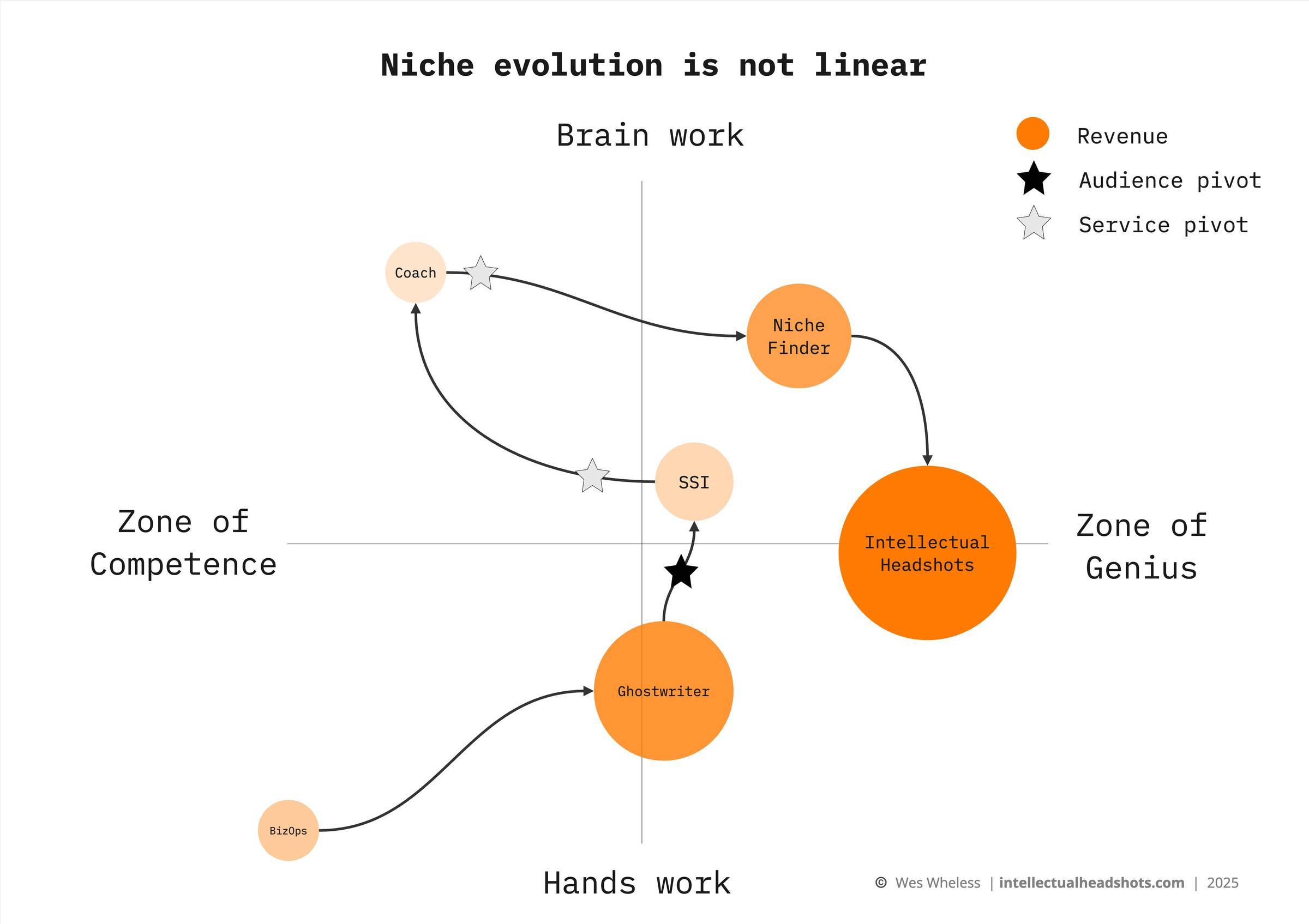 So, if you've been here since January, I’ve written to you 219 times this year -- if you're mathing, I write Mon-Fri and took a short summer hiatus. So first off, thanks for still being here. I hope that’s a signal that you’re getting value from micro-doses of my always-evolving lens on solo consulting. We’ve covered a lot together, and the umbrella theme over all of it has been simply: How to nail your consulting niche and become known for it. In fact, that’s almost exactly the positioning copy my friends Joel & Leah from Kelford, Inc. helped me craft around my business back in January. But let’s go a level deeper, shall we? Just like I preach about value being found in the niche crannies of a domain, I’ve dug through the crannies of my 2025 archive, and thought it'd be fun to share the highest-engagement Lightbulb from each month. This isn't based on opens or clicks (those metrics can be gamed), but rather on the number of your collective replies to a particular email -- the emails that made you feel some sort of way that you just had to write in. That's my internal signal of resonance. Please enjoy the stroll down memory lane, click-in to those you may have missed, and perhaps this year's top posts might prompt some thinking about how to continue optimizing your solo business next year. At the bottom, I'll share the most replied-to Lightbulb of 2025, and a preview of what's coming in 2026. Here we go: January#241 💡 Follow your genius, simplify your offerTLDR: Draw a tight circle around what you’re great at, and sign up for little else February#270 💡 Tossing the shellTLDR: Your corporate context was ephemeral, and your expertise is all that carries on March#285 💡 Assessing a stray opportunity - The CZAR testTLDR: A framework to triage a tempting, but perhaps distracting opportunity April#304 💡 Minding the pain curveTLDR: A visual framework depicting how your approach and message should shift to match the degree of your client's pain. May#337 💡 I’m talking but it’s not landingTLDR: A visual framework on distillation of your expertise from verbal to visual June#339 💡 “The sales prevention department”TLDR: A client's "Intellectual Headshot" - a sharp POV turned into an unforgettable mental image July#366 💡 Watering the weedsTLDR: A visual reminder to quit trying to appeal to everyone August#388 💡 Calm is magneticTLDR: My former finance professor shows us by example the immeasurable value of bringing calm among the chaos. September#401 💡 Self-employed vs freelancerTLDR: How you talk about yourself matters -- the 'freelancer' mindset is a holdover from your corporate life, and it can hold you back. October#411 💡 Very Niche: Seattle Ring HunterTLDR: A very specific solo practice teaches us a few lessons on niche strategy November#434 💡 TOOL: Map your service evolutionTLDR: Finding your niche is a process, and not a linear one. Map template included. December#455 💡 Rethinking your pricing next yearTLDR: A recent Headshots sprint delivered ahead of schedule crystallized some pricing principles: And the most replied-to Lightbulb this year was:November 26, 2025 #443 💡 A quiet confidenceTLDR: Solo consultants continue to amaze me, in their empathetic and vulnerable way _____________________________ Thanks for joining me on this journey, and for all the engagement throughout the year. Have a wonderful break of rest and recharge. Write to me if you're bored and pondering. Otherwise, next year will bring: