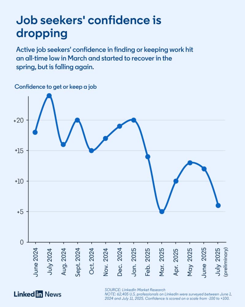 An article from LinkedIn News made the rounds today discussing the trend of workers leaving the 9-to-5. The allure of gig work: Why more professionals are leaving 9-to-5 jobs behind There’s a lot of often-conflated terminology confusing the article a bit — gig work, side hustle, portfolio career, entrepreneurship — but one of the main points made is that this trend is bigger than people getting fed up with corporate roles and doing something different. Rather, the outlook of the job market is so bleak (US data), that workers are moving toward self-employment out of necessity. It’s just getting that hard to find and keep work. This chart doesn’t show it, but job seeker confidence even in April 2020 was around +9 (on a -100 to +100 scale), indicating that now at +6, confidence is below pandemic levels. Ouch. So what does this mean for us already on the solo side? Get ready for more even more talent joining the party. And what does that mean? It’s never been more important to nail your niche and start building your cozy little moat. 💡 -Wes |