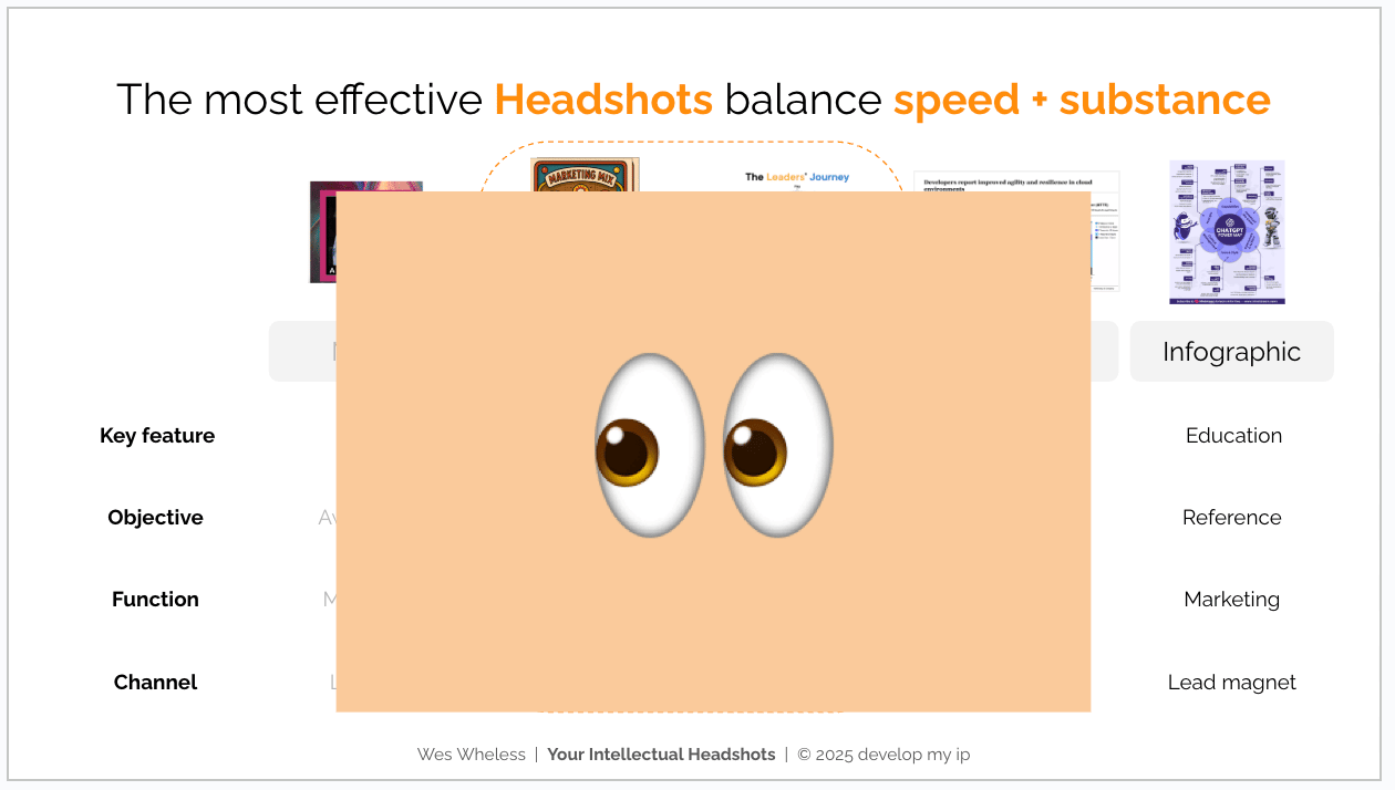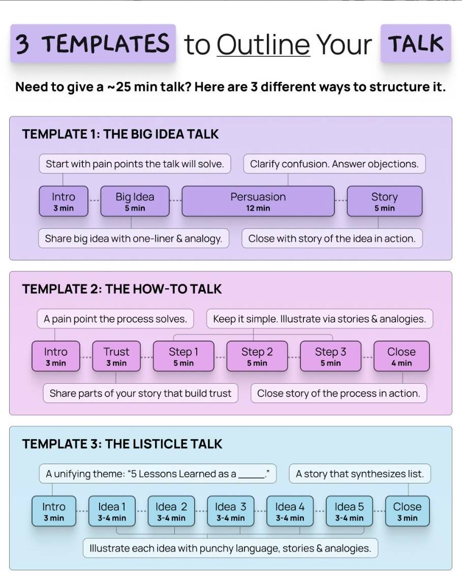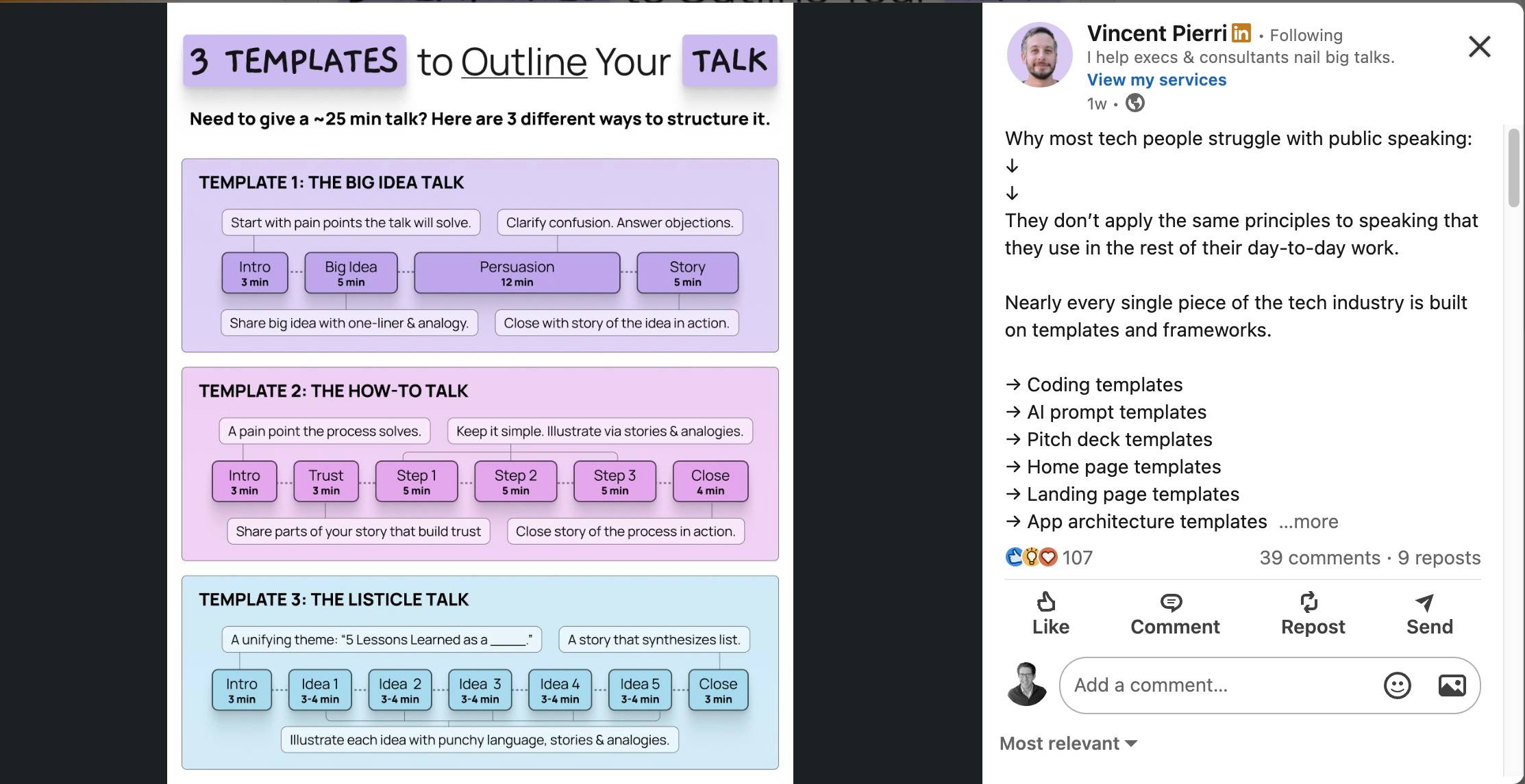 This week on ‘In-the-Wild’, I’ve been seeing a lot of public speaking coach Vincent Pierri’s visuals in my feed. (Probably because I’m squarely in his ICP of execs/consultants who give talks.) His visuals are classic infographics, a subset of Intellectual Headshots I think of as “lots of info, better seen than read”. And hey, everybody loves an infographic, right? In this visual in particular, he’s providing 3 different formats for a 25-minute talk. Overall, I think it’s quite well-done. Welcoming color palette, professional polish, clean display of a lot of information. The question I keep asking on this one though is: What am I supposed to do with it? Or better yet: What am I supposed to do with this right now? Unless this is reaching me while I’m actively procrastinating writing an upcoming talk, it’s not immediately useful. It may prompt a self-evaluation of a past talk thinking, “how did I structure my last one?” but you’re really not too likely to retrace your steps like that during a casual scroll. Most likely, the intent of this infographic is to demonstrate Vincent’s authority in the space. And the intended action is to Save it for another day when you’re actually getting into prep for your next talk. At which point, you’d pull it out, perhaps get started on your own, then maybe reach out to Vincent for 1:1 help. (Vincent also gets the immediate benefit of your ‘Save’ which signals to the algorithm to boost the post. And perhaps you start following him.) This example highlights the long-tail nature of infographics vs. simpler visual formats. While a simpler framework (like last week’s from David A. Fields) can be instantly digested and applied by your audience, infographics serve an entirely different purpose. These are brand-building, authority-boosting assets. Next week, I’ll share my broader framework on the spectrum of different visual formats and their respective uses. Infographics fall on the most detailed end, which can limit their immediate utility. 💡 -Wes |