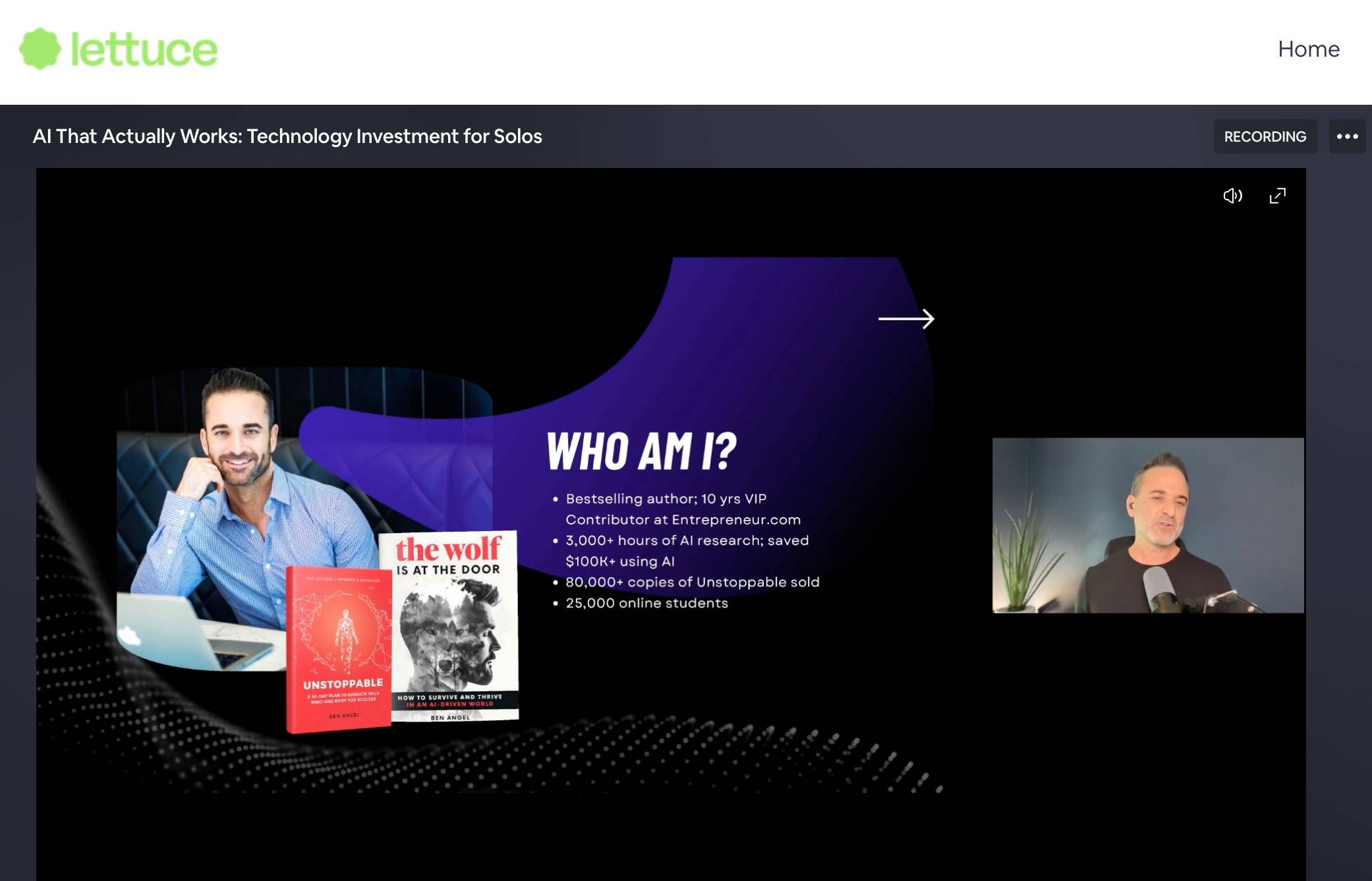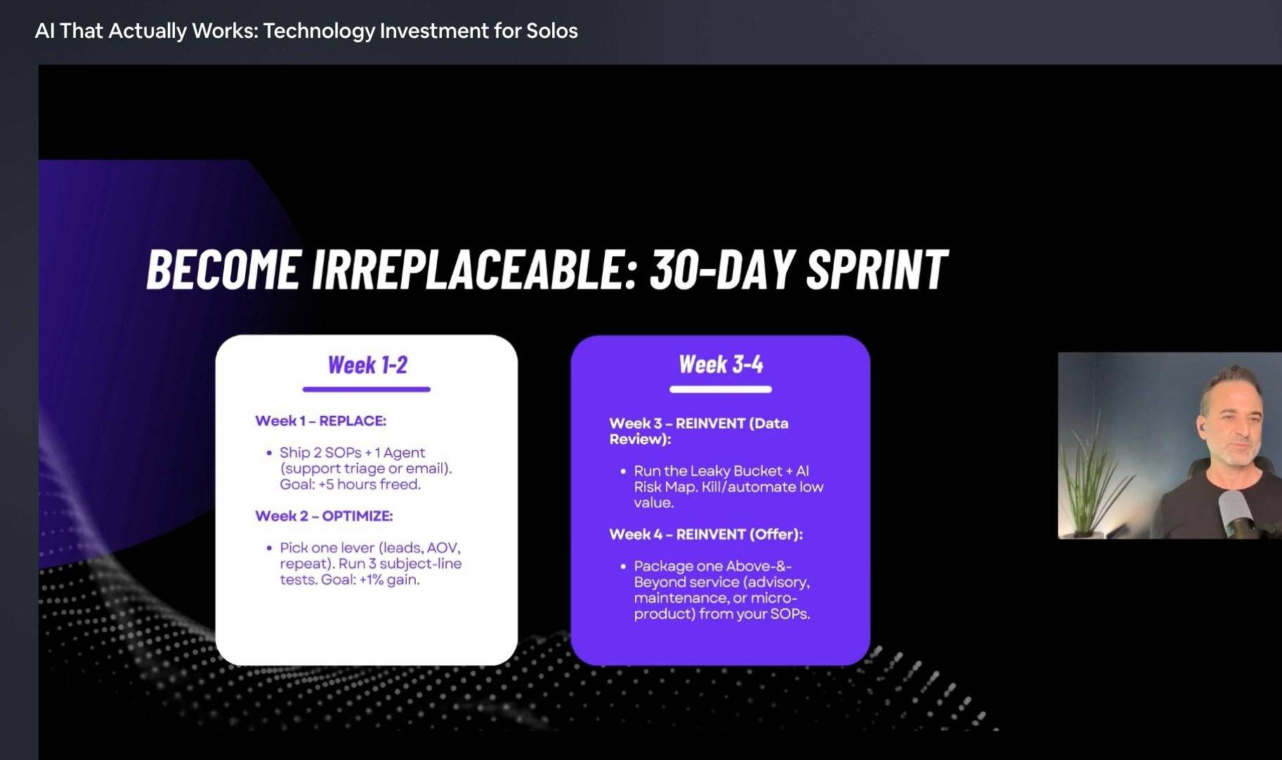I caught author Ben Angel’s session at today’s Solo Summit, put on by Lettuce.co - the topic was AI That Actually Works: Tech Investment for Solos Ben had a lot of fresh insights to share about how AI will undoubtedly change the type of work we’ll do as consultants. He’s even written a book about it, The Wolf is at the Door. ​ With my eyes always peeled for unique visuals, I found this rather understated framework to be quite an effective framing for his talk: Essentially, he’s saying you can fall into one of two camps re: AI adoption. And while this slide is pretty text-heavy, it plainly establishes Ben’s POV, and even more importantly, it naturally forces you to pick a side. Do you want to be a ‘rookie’? Or do you want to be a ‘future-maker’? ​ This set the tone for the rest of the talk, where he discussed different tools and automation opportunities that can set soloists up well in our changing industry. Then he came back to it 30 minutes later, asking the same question again. And closed with a slide detailing his 30-day sprint, cleanly broken up over the same visual layout - weeks 1-2 to get you past ‘rookie’ stage, and Weeks 3-4 to get you to ‘future-maker’. So, in two visuals,
