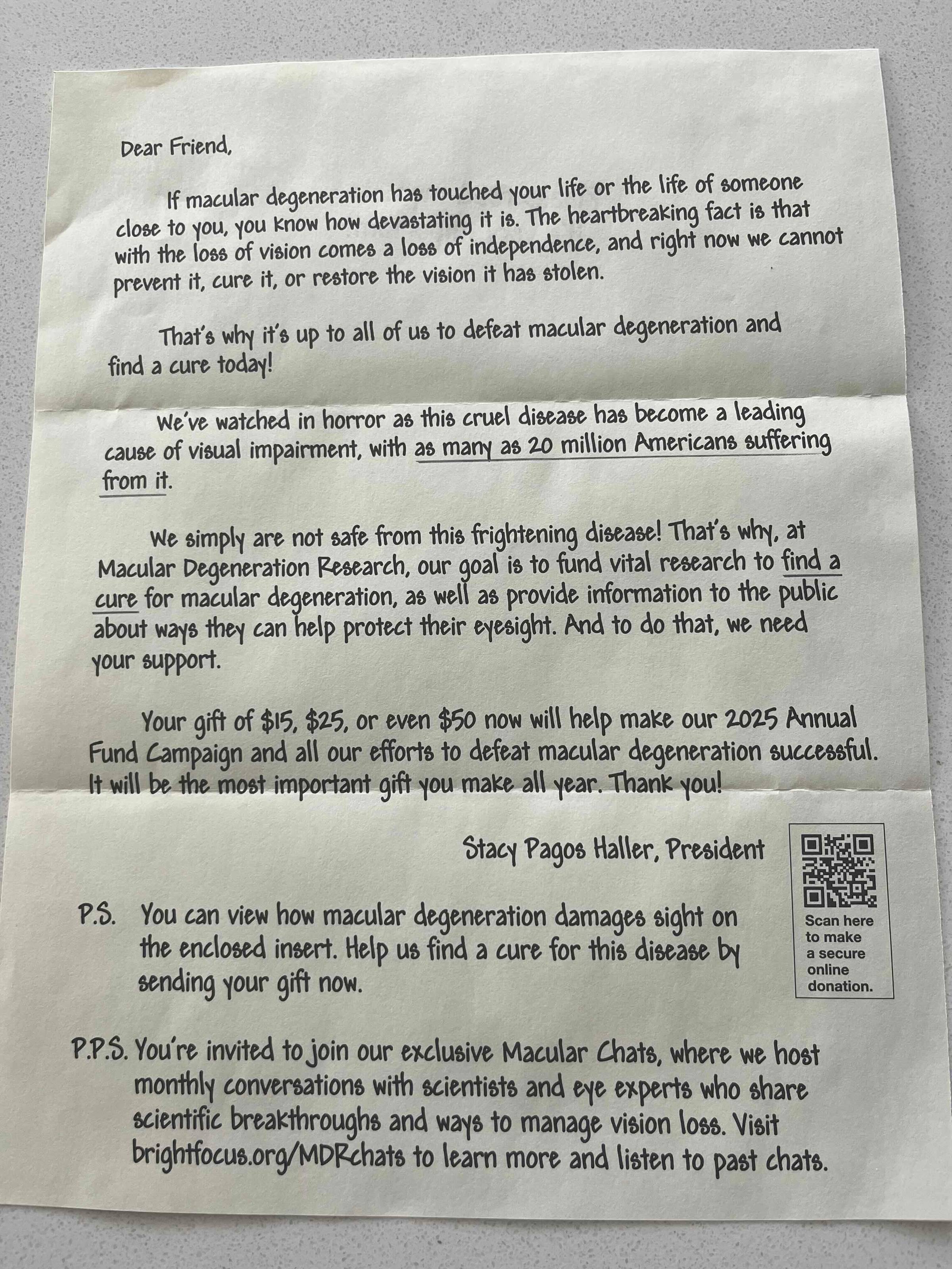 Most of what I get in the mail goes promptly into recycling, but I happened to open this mailer from the Macular Degeneration Research foundation. It started with the letter above (which I didn’t read). But also enclosed was this simple trifold that showed in 5 frames what happens to the vision of someone who suffers from MD. My grandmother had macular degeneration, but I never knew what that was like to live with. This gave me a peek of what that might’ve been like for her. But even without that personal connection, this simple insert telegraphed in an instant the slow horror of this condition in a way that’s hard to forget. With regard to your consulting visuals, your aim is quite similar. Not to shock or scare them. But rather to frame their problem in a way that’s sharp, clever and instantly memorable. Show them that you know what they’re going through. That they can trust that you know the path to relief. And do it all in a few seconds. That’s the power of good visuals. What might your five frames look like? 💡 -Wes |