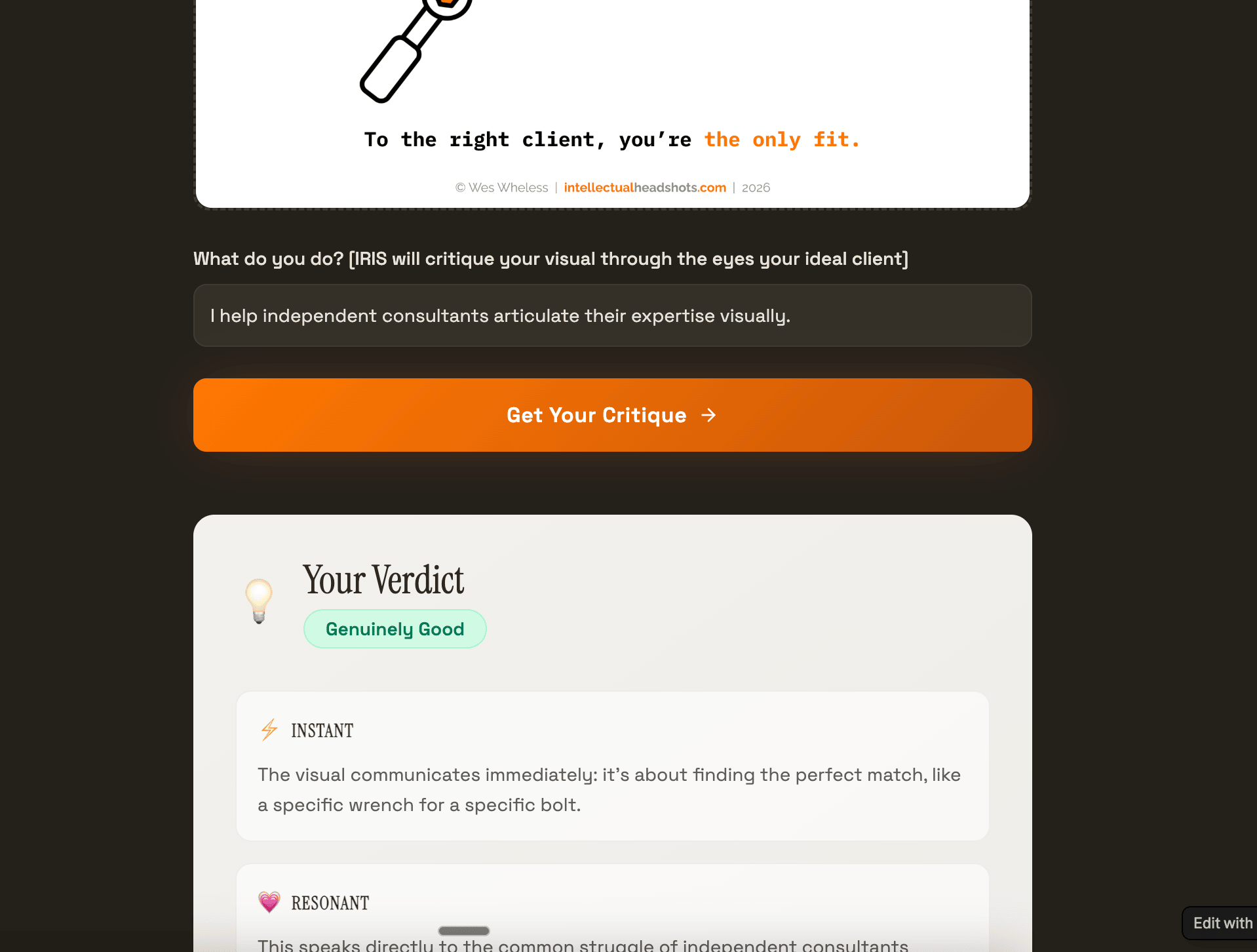 You can complain about LinkedIn slop, or you can elevate above it. Iāve long believed solo consultants undersell their expertise. And getting caught up in fleeting LinkedIn fads or āhacksā only deepens the problem. It seems like most people have gotten the memo to include some sort of visual when posting⦠But I suspect most do so to claim extra real estate in the scroll and/or please the algorithm. As someone whoās centered my business around distilling and telegraphing expertise visually, this behavior strikes me daily as misguided mimicry en masse. Thousands of brilliant experts in their respective domains reducing themselves to the least common denominator⦠A selfie, a two-click NotebookLM infographic, a pull quote in a Canva template. Those are...fine...for occasional top-of-mind awareness... But as a solo consultant, every visual you share has the opportunity to serve as a headshot of your expertise. Something that speaks intimately to your ideal client and sparks some insight and motivation to connect 1:1. Are your visuals up to the task? šļø Meet Iris - my new web app that will critique your LinkedIn visuals before you hit āPostā: