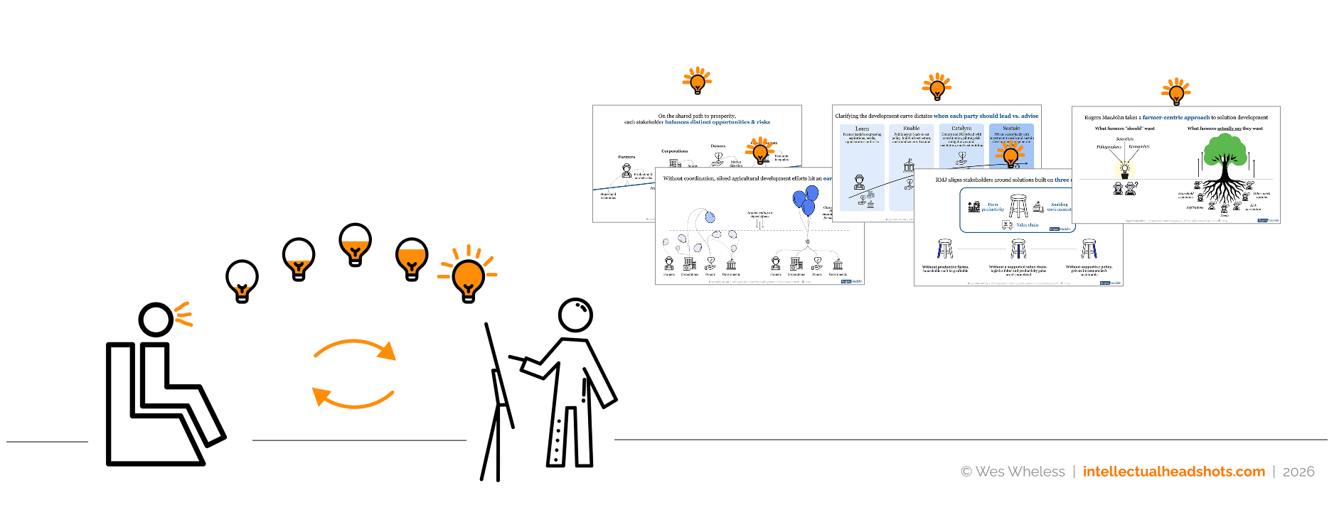 I sit on the receiving end of a lot of consultant monologues. One simple question can elicit a 3-, 5-, sometimes 10-minute response. I don’t mind it. It’s actually by design. Because I’d rather a consultant dump all that on me, than on the prospect they’ve been angling to get a call with for months. Unrefined insights can confuse an already distressed prospect. Unorganized insights can overwhelm them just the same. Walk into a conversation with both, and let’s face it - you’ve probably lost them, and perhaps have done more harm than good. I was wrapping an Intellectual Headshots sprint last month, and my client shared this reflection about our sprint together: We had all these random ideas, right? But it was difficult to kind of convey what we do in a concise way. I think the visuals help do that quite a bit, and just kind of create a storyline through. It helps to crystallize our own thinking in terms of where our value add is, and how we differentiate ourselves and our thinking and our logic around this whole space. This came from a consultant with some objectively impressive consulting chops: