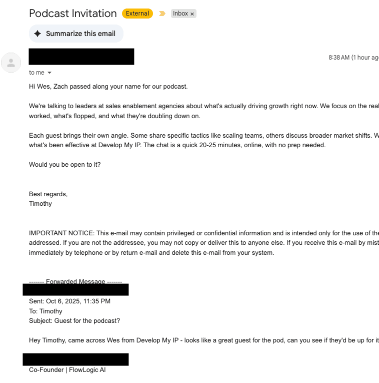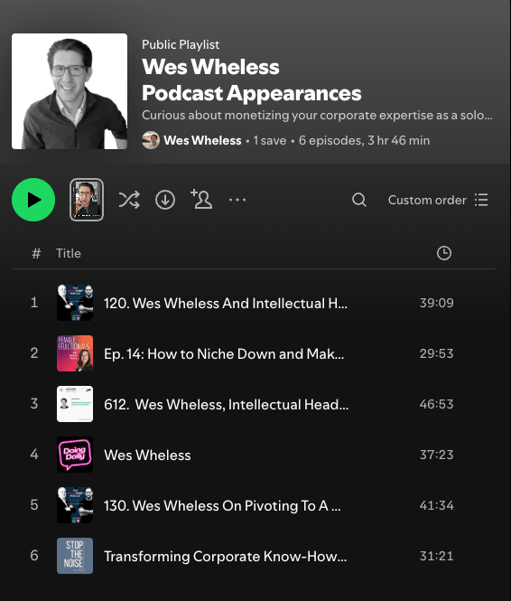 ​ Never been on one before? Check out #238 💡 2-Hour Task: Podcast appearance kickstart for a short primer on how to start getting yourself invited and prepared. ​ Getting ready for a podcast interview? Just last week, I shared how a simple sketch on a notecard kept me on track during a recent appearance. ​ Got a few episodes under your belt? Create a public Spotify playlist of your appearances to boost your discoverability. This takes just a few minutes to set up, and it will be the first thing that pops up when someone types your name into Spotify (how’s that for SEO — ‘Spotify’ Engine Optimization 😂 ) From there, folks doing their diligence on you can take their pick of episodes based on the topic most relevant to them. ​ Steer clear of the cold invites: I get an email like this at least once a week, some more convincing than others. The one I received today even had a shell website spun up on what looks like Lovable, but alas, no podcast to be found: Short rule of thumb: More than likely you will need to be the one barking up the tree to get booked on something, not vice versa. ​ And finally, if you’ve been on a podcast recently (or host one yourself), let me know! Send me a link and a one sentence blurb. If there are more than a few, I’ll send out a compiled list to your fellow Lightbulbers. ​ 💡 -Wes |