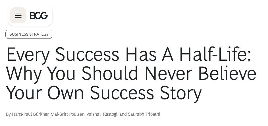 Yesterday I wrote about the pendulum of inaction vs. panic, with my suggestion that as soloists we tend to live in a constant state of reassessment. And rightly so. Not to be outdone (😉), BCG released this article along the same lines about the balance of complacency vs. paranoia in corporate leadership. It’s an interesting short read, citing examples from Intel to Amazon to Virgin Atlantic. The hook: only 17% of companies that significantly outperformed their sector were able to maintain that advantage over 5 years. The gist: success is fleeting, and you always need to be looking at your next move. The article is naturally geared toward CEOs and other corporate executives, but the application to soloists isn’t a far leap. They suggest five key behaviors to stay maintain a “healthy paranoia," modified by me for our context…