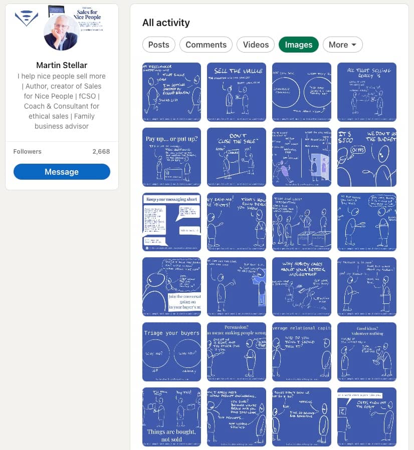But if we tiptoe around monetization, we also circumvent true value exchange and value creation. ā In one of my peer communities, I recently met Martin Stellar - a ācoach and consultant for ethical salesā - who has a refreshingly gentle approach to the topic, which he calls: Sales for Nice People. Thatās actually the umbrella for everything he does: his coaching, his book, his LinkedIn content, his emails⦠And through all of that, he explains his concepts simply and visually. And quite prolifically, I might add. Take a look at his LinkedIn feed ā see all that blue? But volume of visuals aside, did you notice as you looked at the sketch on his book cover up top that in just a couple seconds you essentially knew what this guy was all about. That you actually didnāt need to read any more of this email to make up your mind about whether Martinās approach is interesting to you and worth checking out? ā Thatās the power of an anchor visual ā or as I call it, an āintellectual headshotā. It might just look like a cartoon on the surface, but itās a distillation of career-long POV that invites you to learn more if it speaks to you. ā Do you have something similar? You donāt need to write a book to have something as magnetic as Martinās book cover. You just need tighten up your thinking and codify it. Then let the visual do the work for you. ā š” -Wes ā P.S. Martin's not a client of mine ā he obviously doesnāt need my help in this department š But, if you think you could benefit from a partner to help you crystallize your unique value into a crisp, visual story, let's chat. I have a few complimentary consults remaining this month. And claim 2025 pricing on a January 'Headshots' sprint when you book in December. (That's $500 off. š) ā |