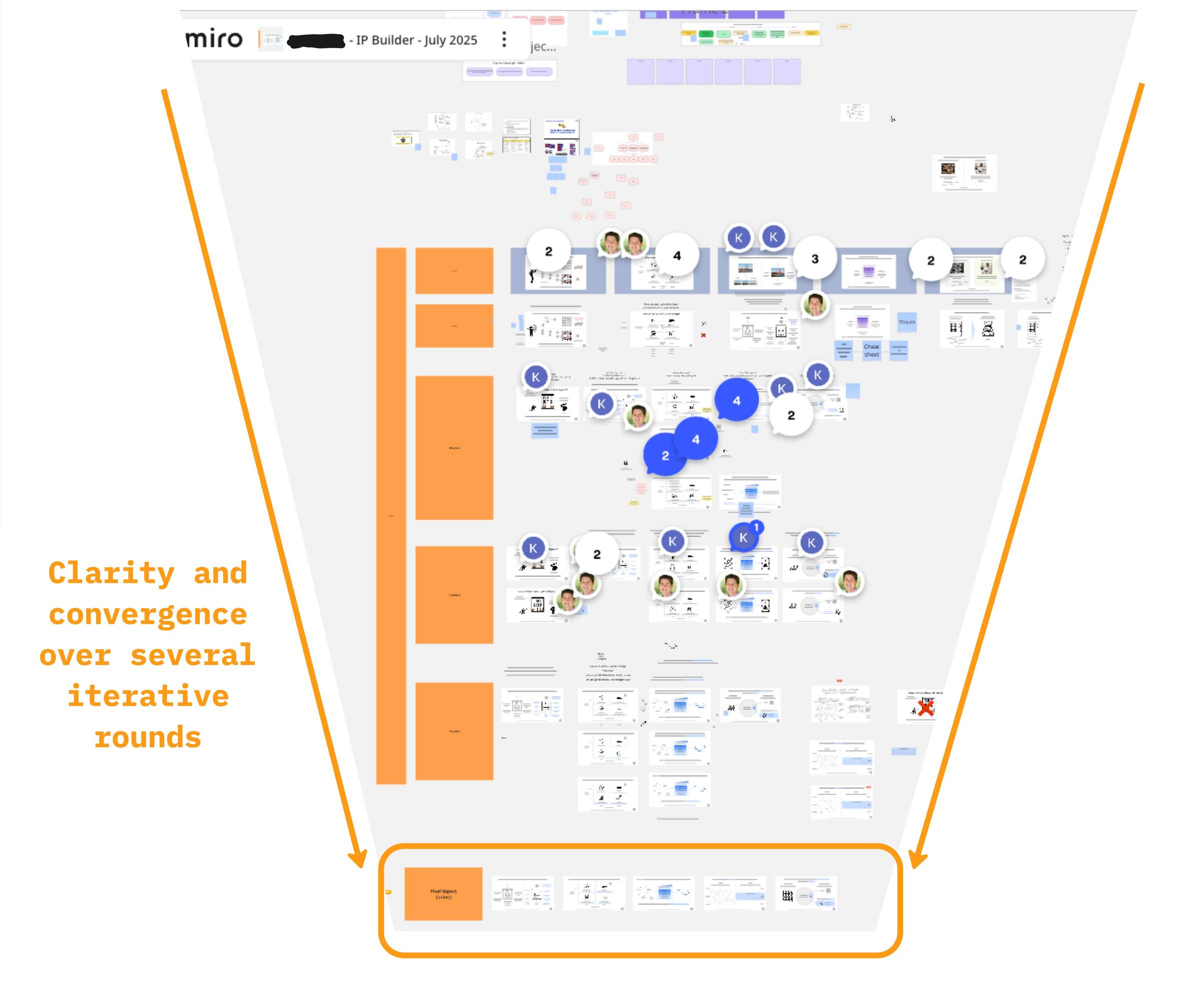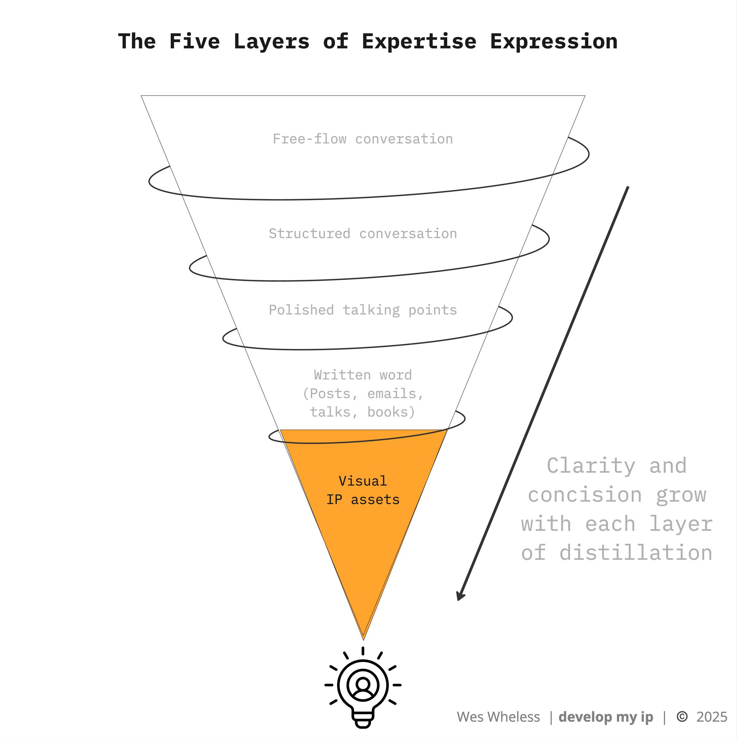 Remember this framework? (From 💡 #337 "I'm talking, but it's not landing") In short, there are several layers of distillation through which you can share your expertise. From casual conversation to structured talking points, to writing, and finally to visuals. This last layer, Visual IP, can appear so shockingly simple you might mistake it for easy or elementary. But zoom in on an IP Builder sprint I completed today, and you’ll see this is still no cake walk. So worth it, though. Clear, durable ‘intellectual headshots’ are the product of iteration, lively debate, and trial & error. And unearthed after several rounds of divergence and convergence .. (all over ~2 weeks, mind you) …are tangible business assets that catch attention. That initiate meetings. That elevate conversations. That telegraph your expertise. That build trust. And that close deals. ​ A couple decades of your expertise. Distilled over a couple weeks. To demonstrate your authority in a couple seconds. ​ Have you stalled at that last layer? Don’t know what you’d want to visualize? That’s exactly what we sort out. Together. ​ 💡 -Wes ​ P.S. Sound interesting? IP Builder Sprints are open for August. ​Book a free intro call to see if it's a good fit and to walk through some unpublished examples. |