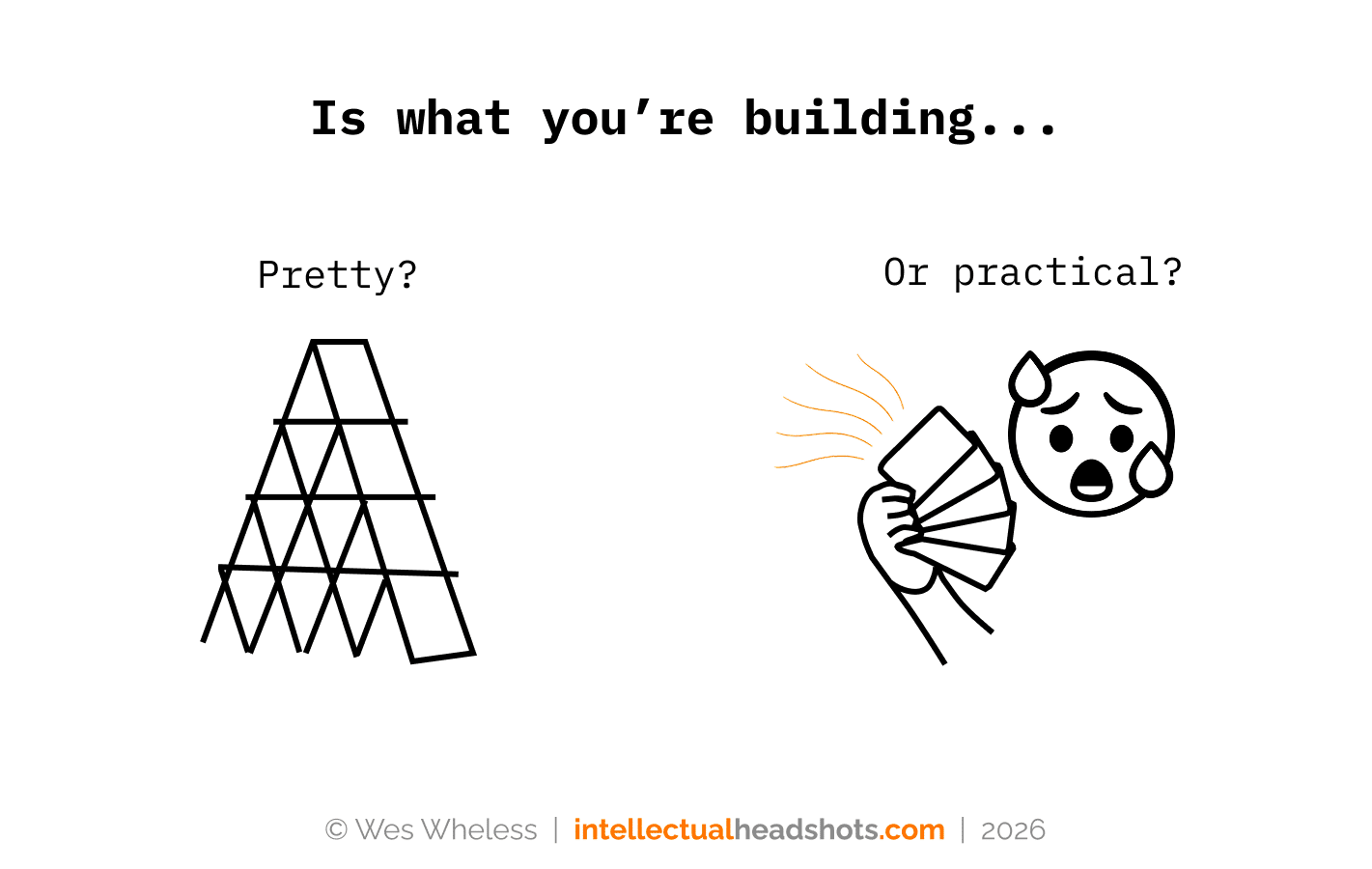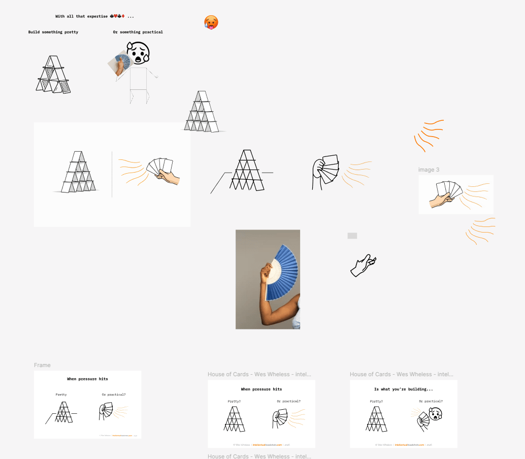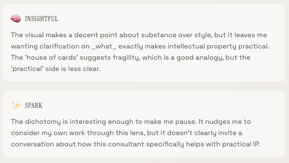 For this weekās Teardown. I thought it was only fair to share an example where my own visuals have come in below the bar. (Oh yes, there are many.) So I put my āHouse of Cardsā Headshot through the IRIS app. This visual metaphor literally came to me in my sleep a few weeks ago. The general idea is that experts/consultants can often get caught up in pretty deliverables, but really, especially now, clients are looking for relief. In my view, an Intellectual Headshot (framework, time-series, process visual) can help ground a distressed client or help them organize their own thoughts toward solution. Thatās what I sought to express, creatively. Despite the minimalist look, it actually took quite a bit of time to simplify the concept and captions, and after a couple hours, I was happy enough to publish it. And upon retrospective evaluation, IRIS slapped me with āNoticed, but Fleetingā. Ouch. Specifically, she said yes, the dichotomy was instantly graspable and self-reflective, but that the visual overall was too detached from my service. (Sheās not wrong.) And probably most importantly, IRIS said it didnāt inspire a conversation about help with practical IP. So, what now? She gave me a couple ideas to rethink the visual.