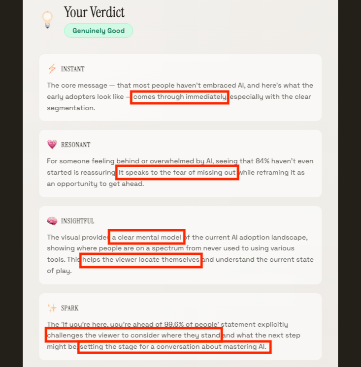 Your LinkedIn feed is probably full of these. Unfortunately. Dime-a-dozen laundry lists of tips for leveraging AI tools. It seems helpful. Like, there’s gotta be some good nuggets in there somewhere. But what do you actually DO with something like this, aside from saving it in a folder and never looking at it again. This example (creator name redacted) is one of the more egregious anti-examples I've seen, if not outright laughable. There’s so much packed in, it’s essentially illegible, and even if you could read it, it’s way too overwhelming, putting all the onus on the viewer to sift out the value on their own. There’s no world where someone is using this as a checklist, or printing it out and hanging it on their wall. So what is the point? ​IRIS had a field day with this one: On the other hand there’s something like this, from Ruben Hassid: It might look like there’s a lot going on, but it’s a lot more streamlined and intentional. One mental model: spectrum of AI adoption One implicit ask: where are you on this chart? One CTA: learn with me stay ahead of the pack No laundry list. No homework. Just a clean message and an invite. IRIS nailed the analysis: It’s dangerously easy to make a visual these days. It’s hard to make one that will actually resonate. But it’s worth making the effort. (IRIS can help.) 💡 -Wes |